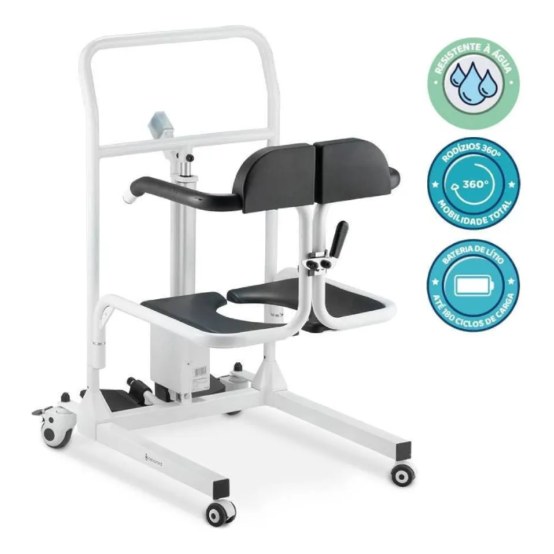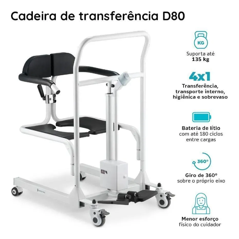 A Cadeira de Transferência D80 Dellamed é uma solução versátil e resistente, especialmente projetada para atender às necessidades de pessoas com mobilidade reduzida. Com capacidade para suportar até 135 kg, esta cadeira apresenta um sistema de elevação eletrônica que facilita a transferência do usuário entre diferentes locais. Além disso, ela é um verdadeiro 3 em 1, desempenhando as funções de cadeira de transferência, cadeira de transporte interno e sobre vaso, oferecendo praticidade e conforto em diversas situações. Equipada com rodas com trava, proporciona segurança e estabilidade durante o uso, especialmente para acamados e cadeirantes. Este modelo de cadeira eletrônica conta com a classificação IP44, garantindo proteção contra respingos de água e assegurando durabilidade e segurança em ambientes úmidos.